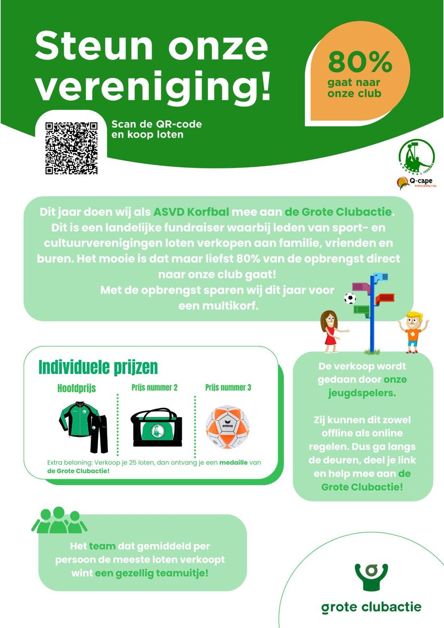 Dit jaar doen wij met ASVD Korfbal voor het eerst sinds lange tijd weer mee aan de Grote Clubactie! We hopen natuurlijk met z’n allen veel loten te verkopen, zodat we veel leuke dingen kunnen doen met het geld wat we hiermee ophalen. Wat we in ieder geval hopen te kunnen financieren, is een nieuwe multikorf op het grasveldje naast het korfbalveld. Vanaf 20 september start de Grote Clubactie en kunnen al onze jeugdleden op pad met hun verkoopkaart. Deze verkoopkaarten worden komende week uitgedeeld op de trainingen.