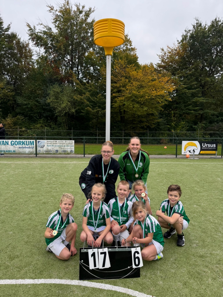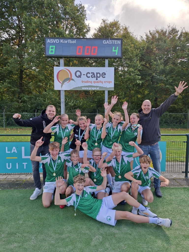 Ook op 4 oktober wist ASVD | Q-cape J3 het kampioenschap binnen te halen door de thuiswedstrijd met 7-0 te winnen van Oranje Zwart J6. Ook dit C-team maakte kans om ongeslagen kampioen te worden, maar verloor de laatste wedstrijd in Zwolle nipt met 3-2 bij Sparta J5. Medailles voor trainers Thirza en Naomi en natuurlijk de spelers Jesse, Naut, Evi, Fey Lin, Floor, Hilde, Isabelle, Jasmijn, Liz, Sophie en Tess.